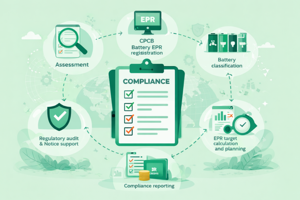 ReCirculytics supports organisations across the full lifecycle of Battery EPR compliance in India—from regulatory applicability assessment and CPCB portal registration to EPR target planning, credit procurement, reporting, and audit readiness.