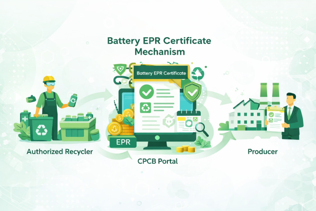 The Battery EPR framework operates through a digital certificate-based mechanism, where recycling activities generate EPR certificates that producers can procure to fulfil their obligations.Under the Battery Waste Management Rules, 2022, producers must: